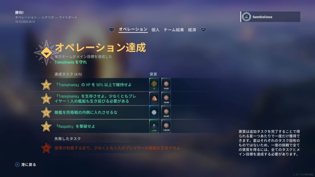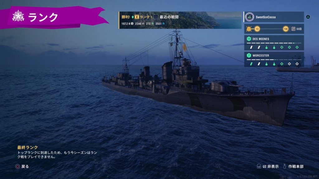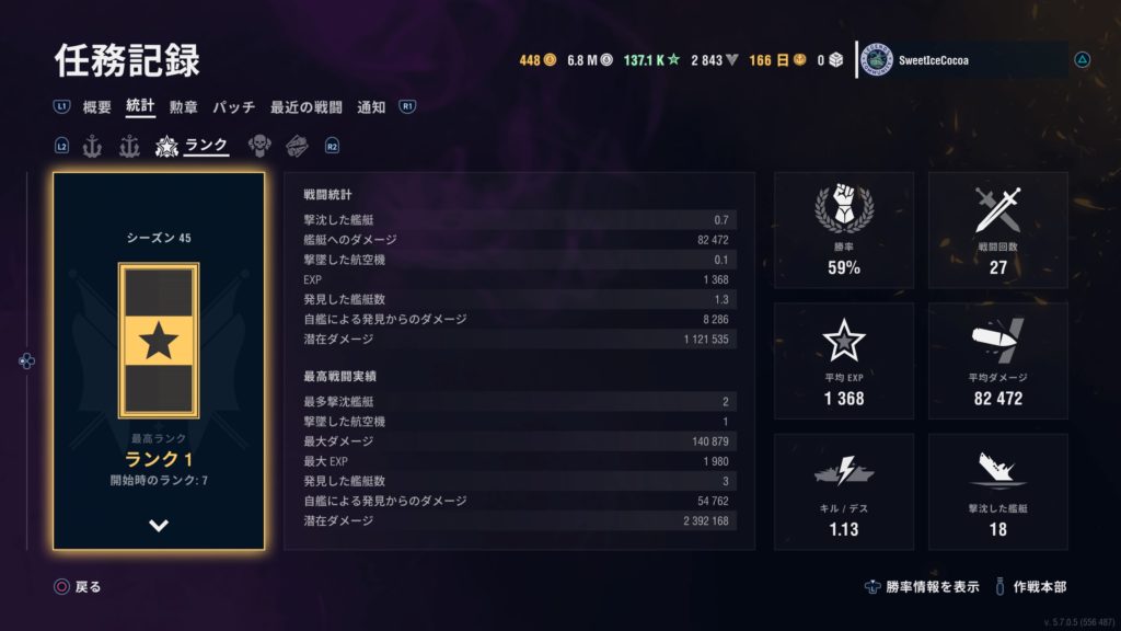 今回のランク戦は厳しい戦いの連続でした。最初武蔵でやってヒドイ目にあったので、途中からはジュゼッペ・ヴェルディに変更。この船は副砲特化での運用、おまけにレーダー持ち戦艦という事で、敵駆逐艦に対する牽制効果は抜群でしたね。なによりランク1まで行けて良かったです!