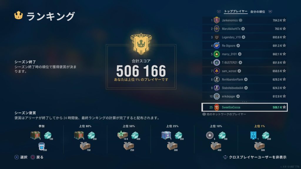 アリーナ戦シーズン15が終わりました。参加した皆様はお疲れ様でした。自分は今回初めての上位1%を達成でき、最終的には全世界で25位という大満足の結果で終わる事ができました。ソロでここまで行けたというのは、自分にとってとても大きな自信に繋がります。ありがとうございました!