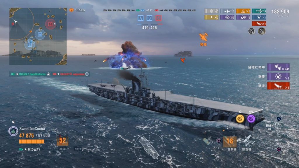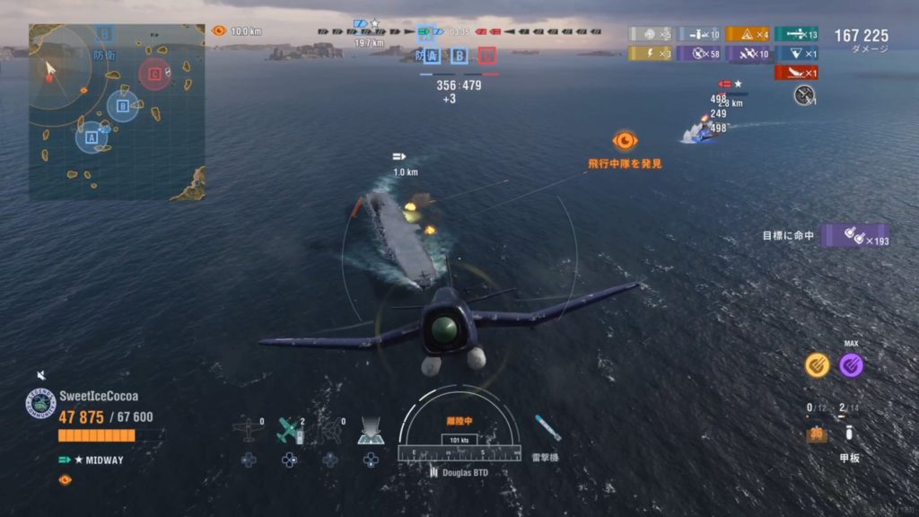 ミッドウェイ対白龍の戦いに勝利しました! 航空機計72機撃墜。副砲命中弾241発。滅多に見られない空母同士の接近戦で、副砲の撃ち合いが胸熱な戦いでした。与ダメ数も凄い!