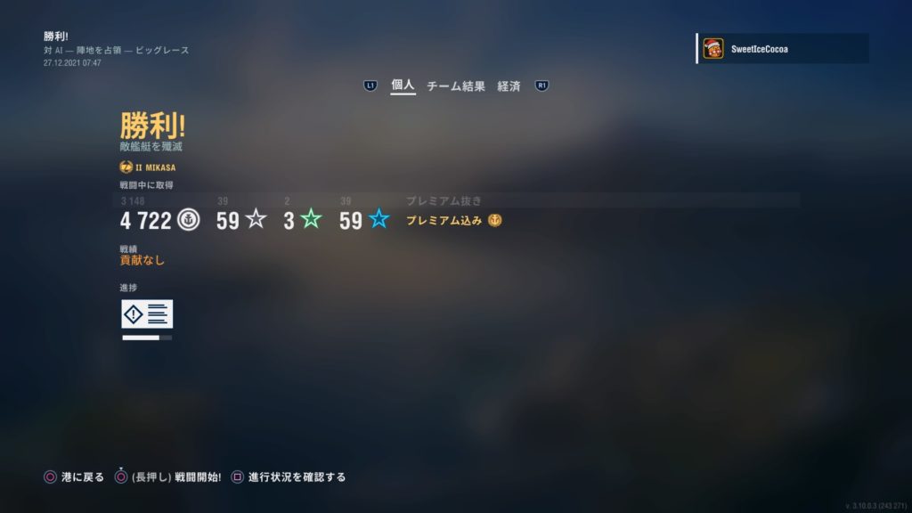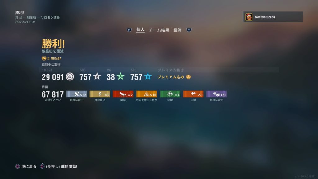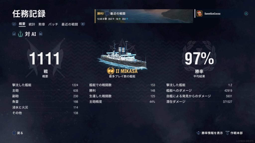 「勝手に三笠チャレンジ!」と銘打って、ひたすらAI戦を周回していたんだけど、与ダメージ数と副砲命中数はこれが限界だったよ。今度は通常戦、行ってみようかな…